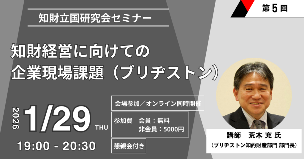 知財立国研究会セミナー「知財経営に向けての企業現場課題(ブリヂストン)」【2026年1月29日(木)19:00~】