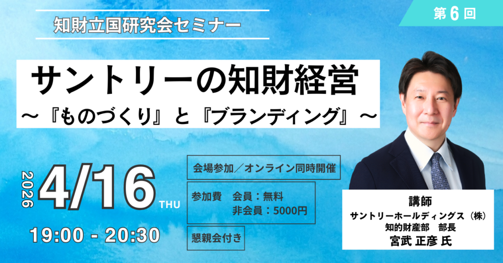知財立国研究会セミナーサントリーの知財経営 ~『ものづくり』と『ブランディング』~【2026年4月16日(木)19:00~】